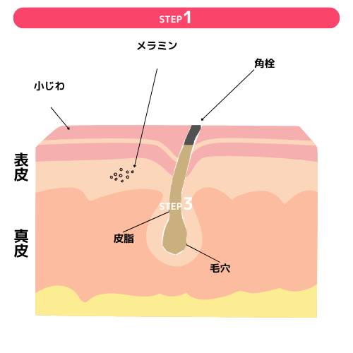 ケミカルピーリングとは、専用の薬剤を顔全体に塗布し、皮膚の古い角質層をやさしく剥がす美容医療です。薬剤の働きで肌のターンオーバー(生まれ変わり)を正常化・促進し、しみ・そばかす・くすみ・にきび・にきび跡・小じわ・毛穴の開きなど、さまざまな肌トラブルをまとめてケアします。
