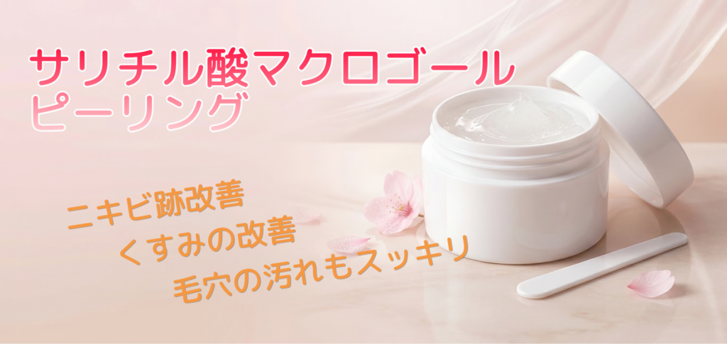 サリチル酸マクロゴールピーリングは、古い角質や毛穴汚れをやさしく取り除き、肌のターンオーバーを整える人気のピーリングです。副作用が少なく、はじめてのピーリングにもおすすめです。
