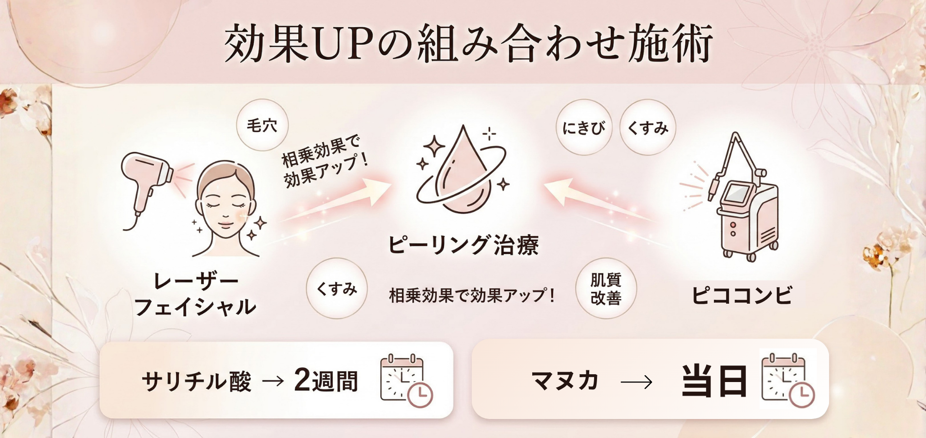 サリチル酸ピーリングはレーザー施術と2週間あけてご案内、マヌカピーリングは同日施術も可能です。
