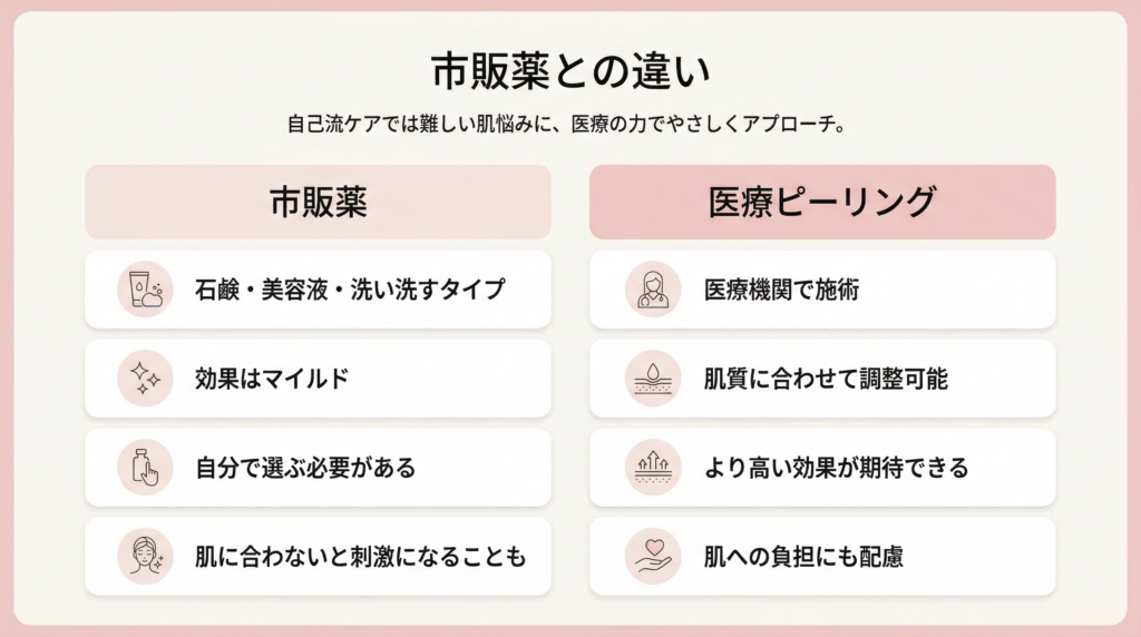 市販のピーリング剤と比べて、ケミカルピーリングは医療機関で行う専門的な肌治療です。薬剤の濃度が高いため、よりしっかりとした効果が期待できるだけでなく、お一人おひとりの肌質やお悩みに合わせて薬剤を調整できるのも特長です。セルフケアでは難しい毛穴・くすみ・にきび跡などにも、肌への負担に配慮しながらアプローチできます。